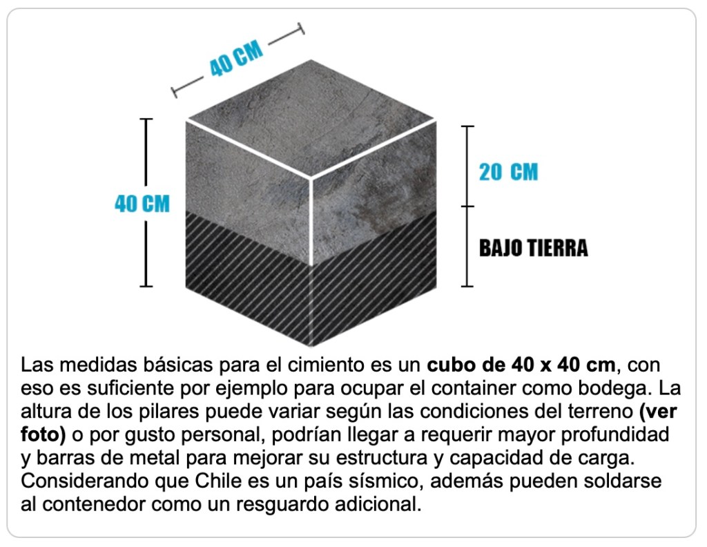 Sin embargo el diseño y dimension de la fundación, se define en relación al uso del modulo, peso del modulo y capacidad de soporte del suelo, y como se indica en el presupuesto, es responsabilidad del cliente su ejecución in situ.